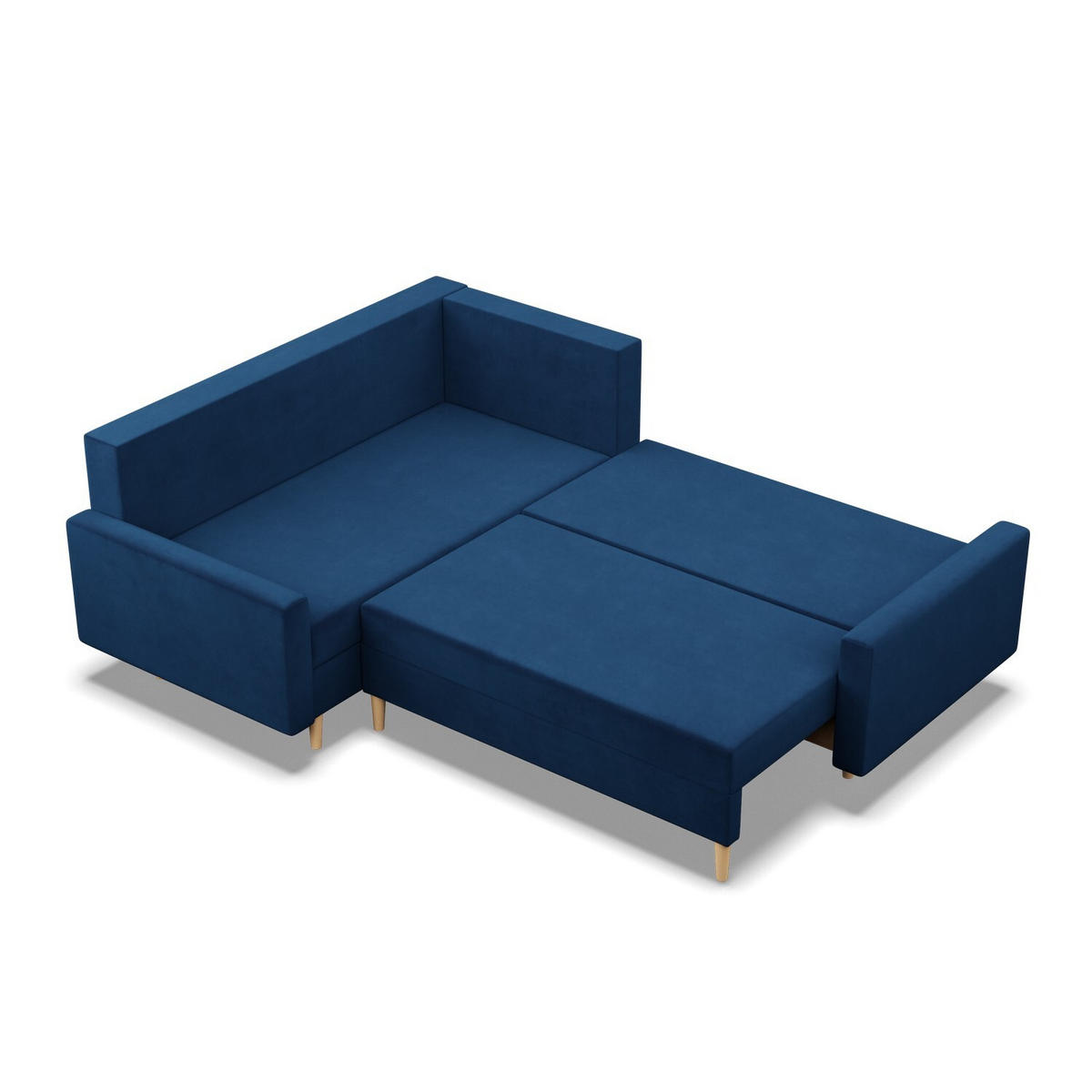 Die Funktionalität des Ecksofas Blank wird durch einen Bettwäschebehälter erweitert, der eine bequeme Aufbewahrung zusätzlicher Textilien ermöglicht und die Raumnutzung optimiert. Dieses Möbelstück kombiniert modernes Design mit Komfort und Funktionalität und ist die ideale Lösung für tägliche Erholung.