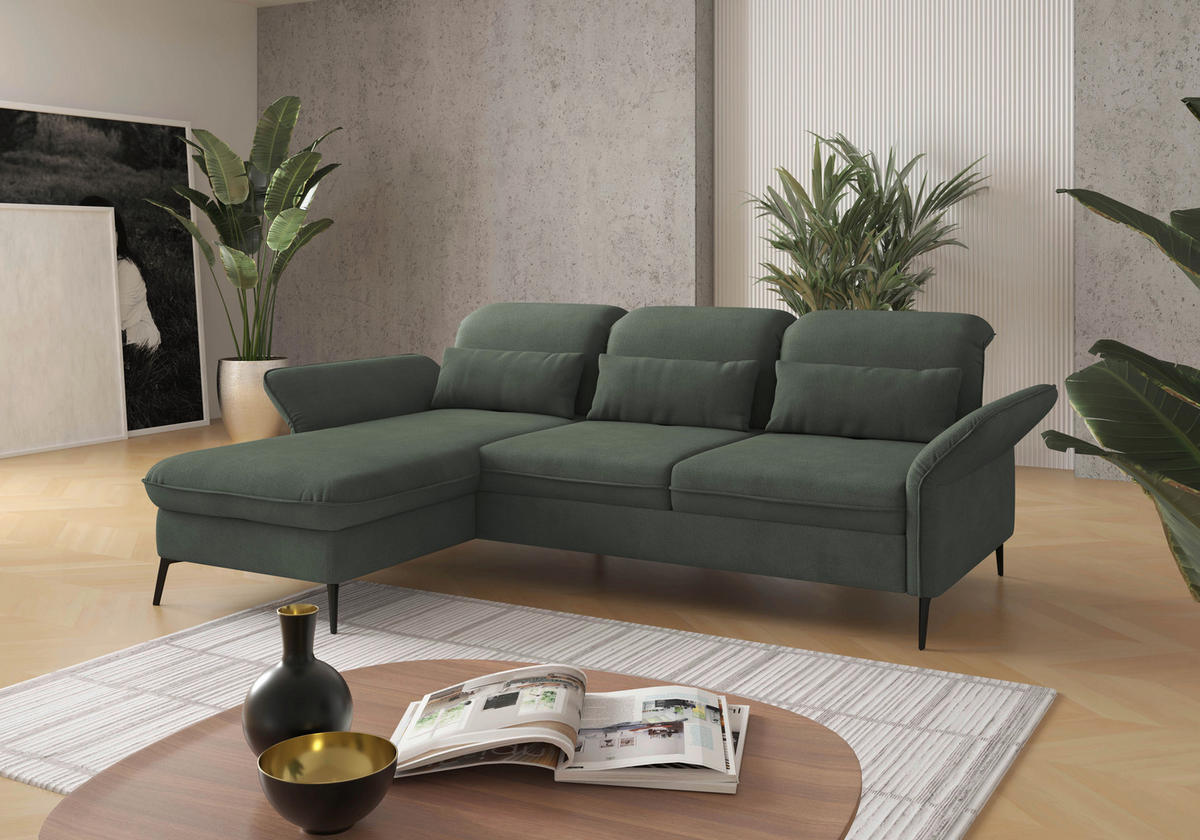Wenn dieses grüne Ecksofa von SIT & MORE mit Flachgewebe-Bezug bei Ihnen einzieht, dreht sich alles um Behaglichkeit!