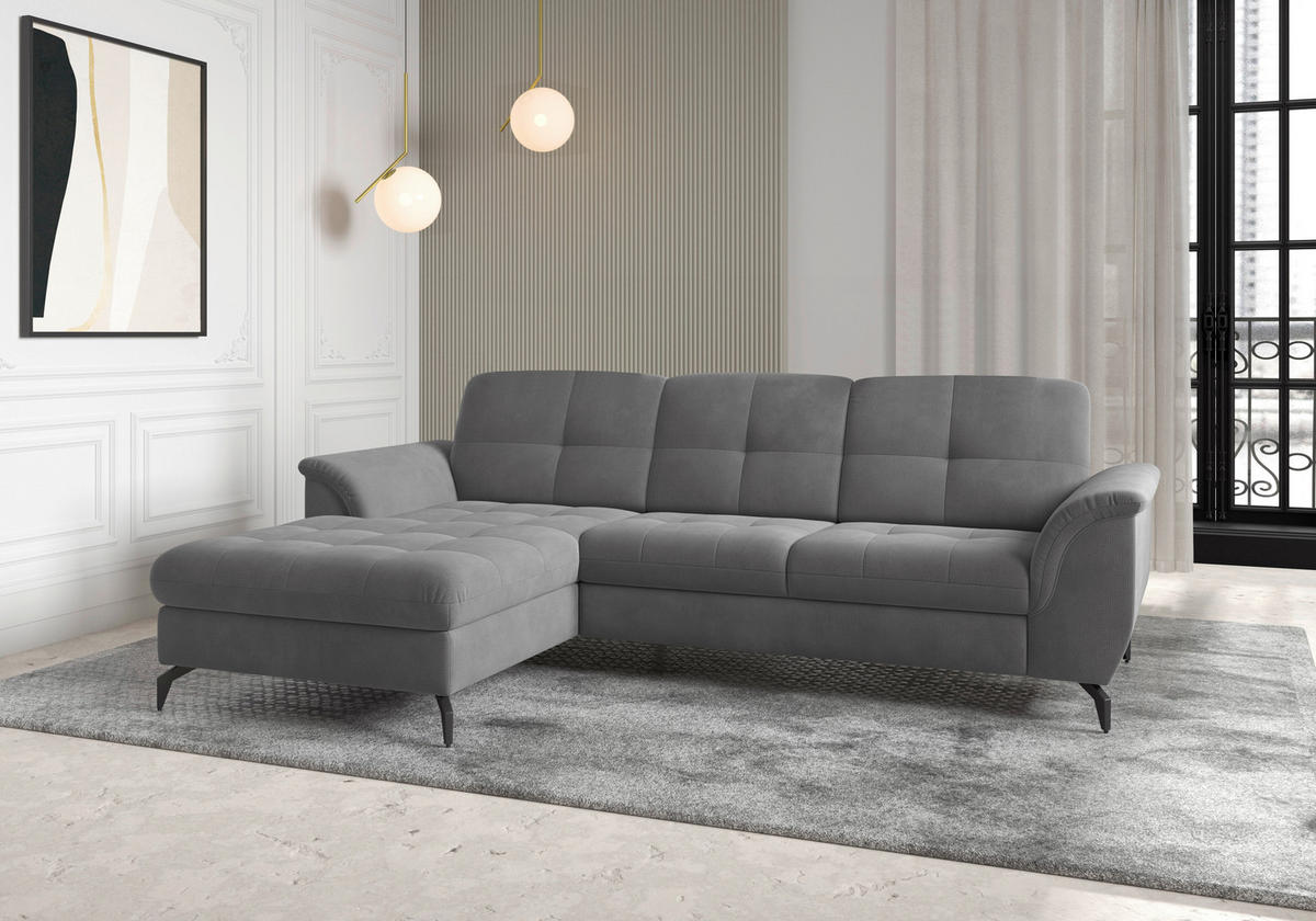 Absolut sehenswert Mit dem zurückhaltenden Kolorit in Grau bietet das Möbel eine ansprechende Optik, die sich geschmackvoll in unterschiedliche Einrichtungskonzepte einfügt. Einen festen Stand gewährleisten die hohen Winkelfüße aus mattem Stahl in Schwarz, die zugleich das Design vervollständigen. Wo eine behagliche Life-Balance und häusliches Wohlempfinden gefragt sind, führt an diesem grauen Ecksofa von SIT & MORE mit Flachgewebe-Bezug kein Weg vorbei!
