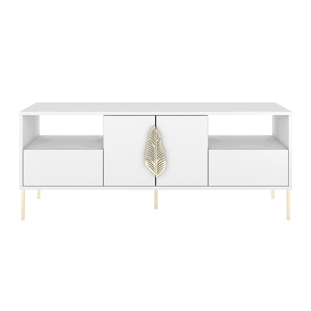 Außergewöhnliche Ästhetik - Elegante TV-Kommode in arktischem Weiß, veredelt mit goldenen Metallakzenten: einem dekorativen Griff in Blattform und schlanken Beinen.