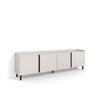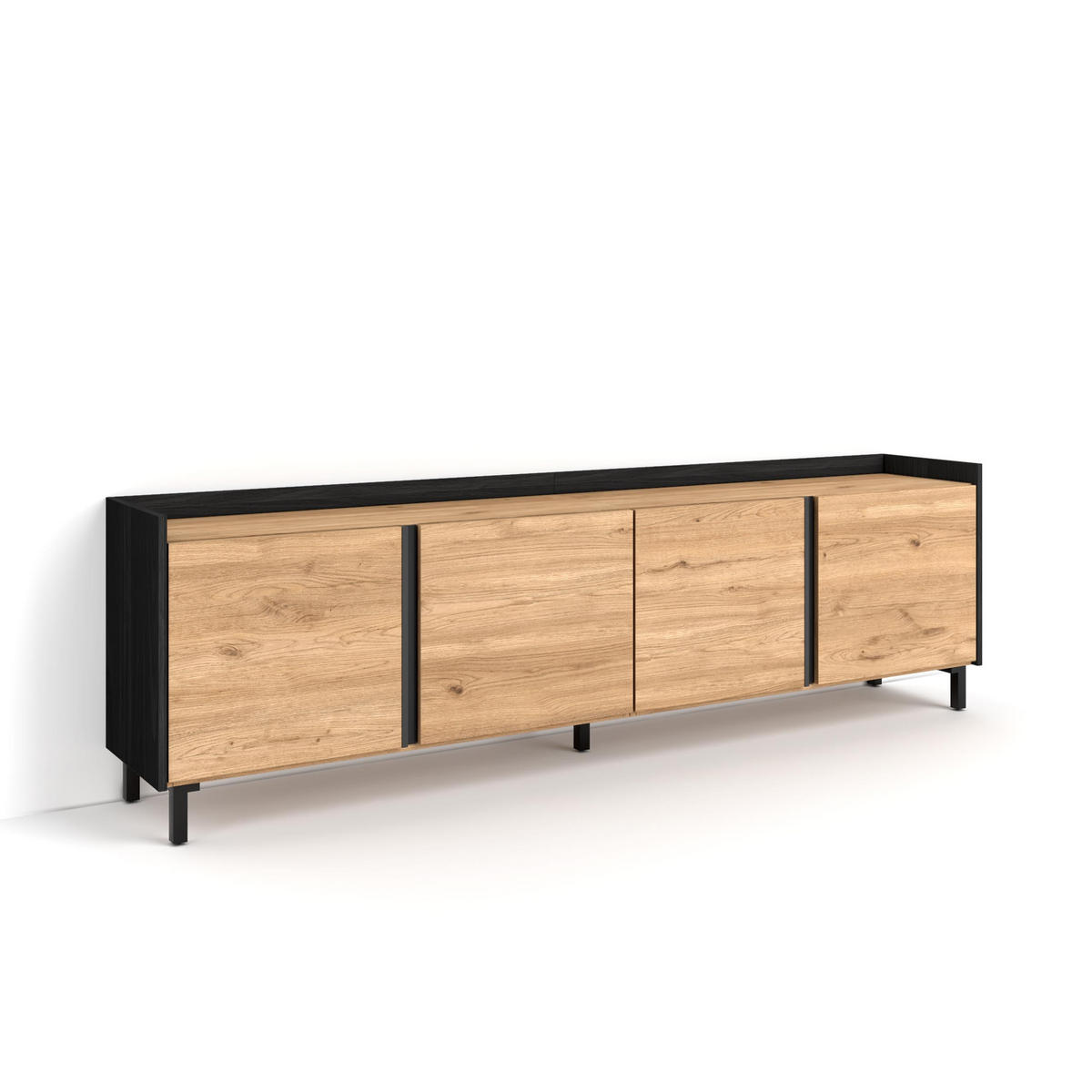 TV-Modul mit Klapptüren und großem Stauraum. Scharniere mit Soft-Close. Aluminiumgriffe. Abmessungen des Moduls: 103 cm breit, 50 cm hoch, 35 cm tief. Farbe: eiche und schwarzmit Maserung un hochwertiger Holzoptik.