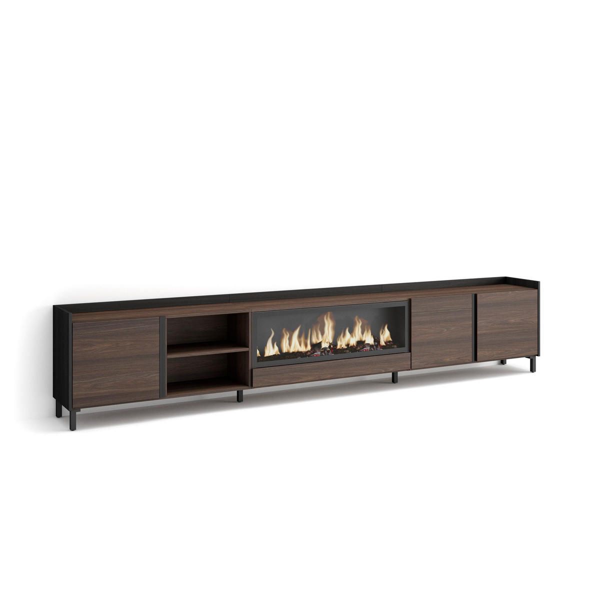 TV-Modul mit Klapptüren und großem Stauraum. Scharniere mit Soft-Close. Aluminiumgriffe. Abmessungen des Moduls: 103 cm breit, 50 cm hoch, 35 cm tief. Farbe: dunkler eiche und schwarz mit Maserung un hochwertiger Holzoptik.