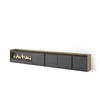 TV-Modul mit Klapptüren und großem Stauraum. Scharniere mit Soft-Close. Aluminiumgriffe. Abmessungen des Moduls: 103 cm breit, 50 cm hoch, 35 cm tief. Farbe: mattweiß und helle eiche mit Maserung un hochwertiger Holzoptik.