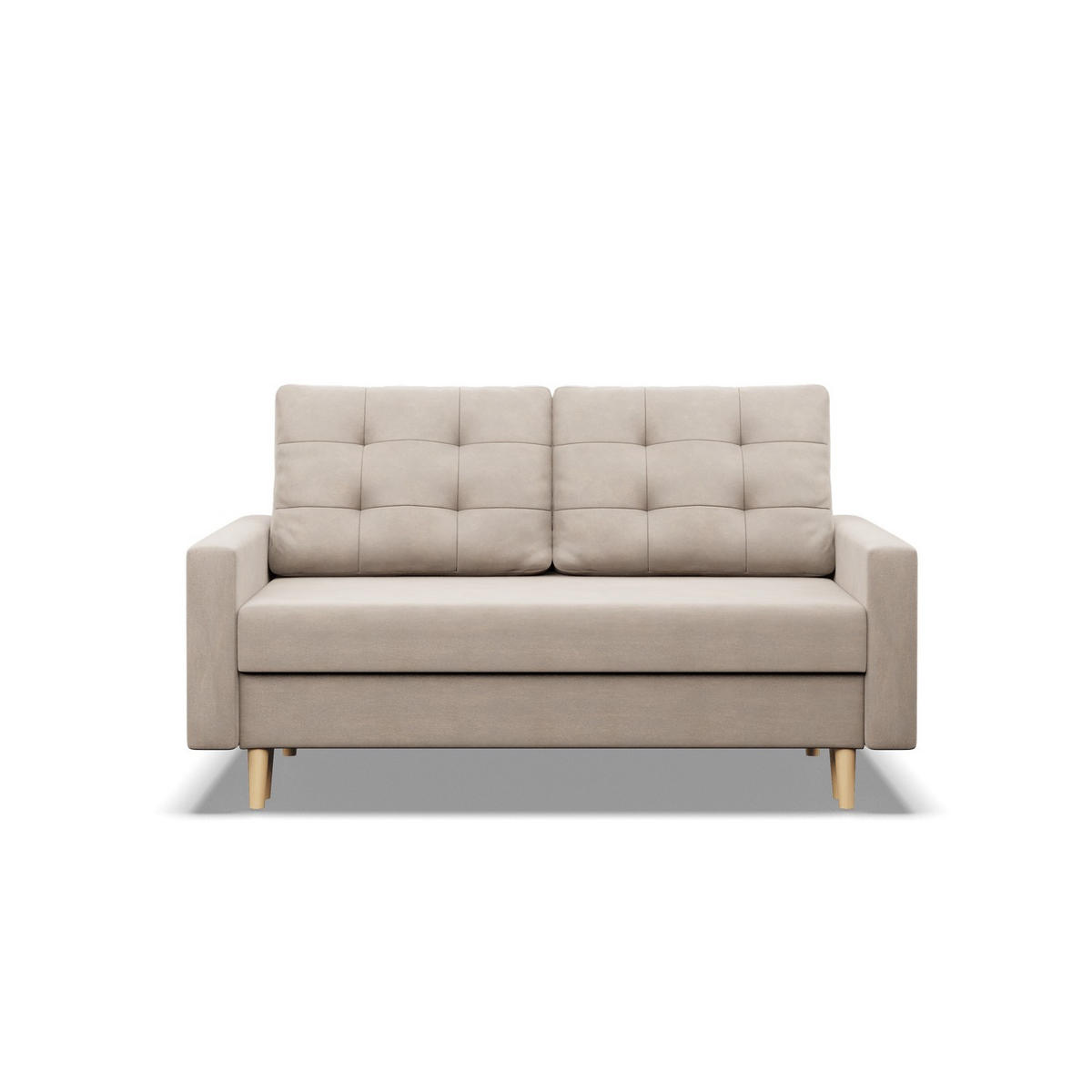 Dieses 2-Sitzer-Sofa vereint viele Funktionen: Ein Bettkasten bietet zusätzlichen Stauraum, hohe Buchenholzbeine garantieren eine bequeme Reinigung und eine einfache Schlaffunktion mit Schnellausklappsystem ist eine gute Lösung, wenn Sie von Gästen mit Kindern überrascht werden.