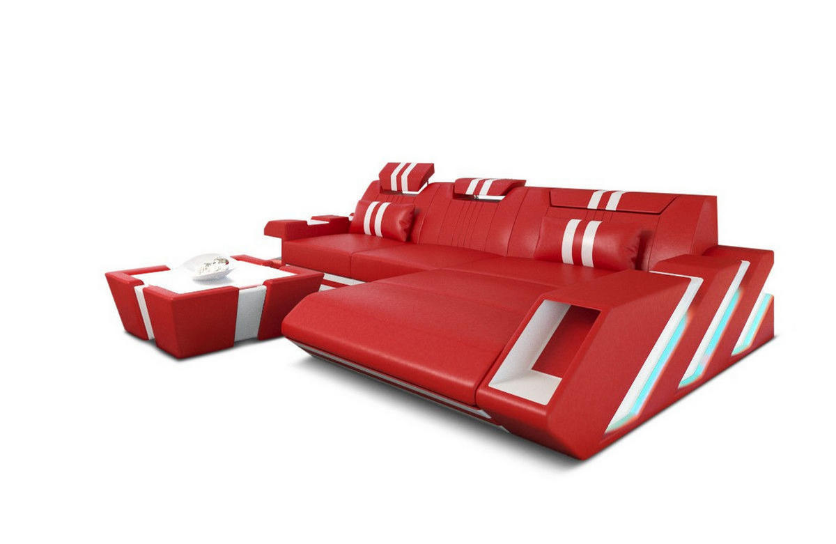 Das Ledersofa Apollonia in L-Form von Sofa Dreams vereint modernes Design mit erstklassigem Komfort. Die großzügige Ottomane bietet viel Platz zum Entspannen, während die verstellbaren Kopfstützen individuell an Ihre Bedürfnisse angepasst werden können. Ein besonderes Highlight ist die integrierte LED-Beleuchtung mit Farbwechsel, die per Fernbedienung gesteuert wird und für stimmungsvolle Akzente sorgt. Optional kann das Sofa mit einer Sitzheizung, einer Bettfunktion und USB-Anschlüssen ausgestattet werden, um den Komfort weiter zu erhöhen. Gefertigt in der EU nach höchsten Qualitätsstandards, bietet das Apollonia-Sofa eine Kombination aus Funktionalität und Stil für Ihr Wohnzimmer.