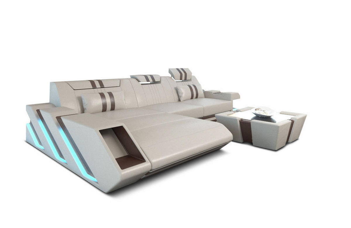 Das Ledersofa Apollonia in L-Form von Sofa Dreams vereint modernes Design mit erstklassigem Komfort. Die großzügige Ottomane bietet viel Platz zum Entspannen, während die verstellbaren Kopfstützen individuell an Ihre Bedürfnisse angepasst werden können. Ein besonderes Highlight ist die integrierte LED-Beleuchtung mit Farbwechsel, die per Fernbedienung gesteuert wird und für stimmungsvolle Akzente sorgt. Optional kann das Sofa mit einer Sitzheizung, einer Bettfunktion und USB-Anschlüssen ausgestattet werden, um den Komfort weiter zu erhöhen. Gefertigt in der EU nach höchsten Qualitätsstandards, bietet das Apollonia-Sofa eine Kombination aus Funktionalität und Stil für Ihr Wohnzimmer.