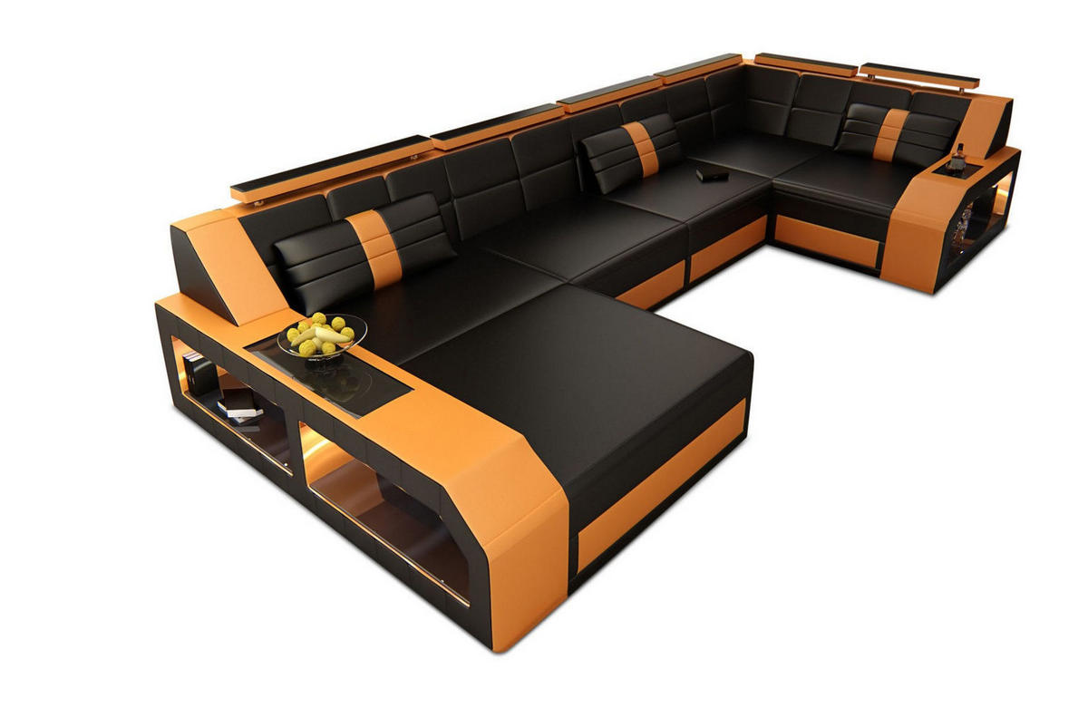 WOHNLANDSCHAFT Arezzo U - Schwarz/Orange, Leder (380/86/197cm) - Sofa Dreams