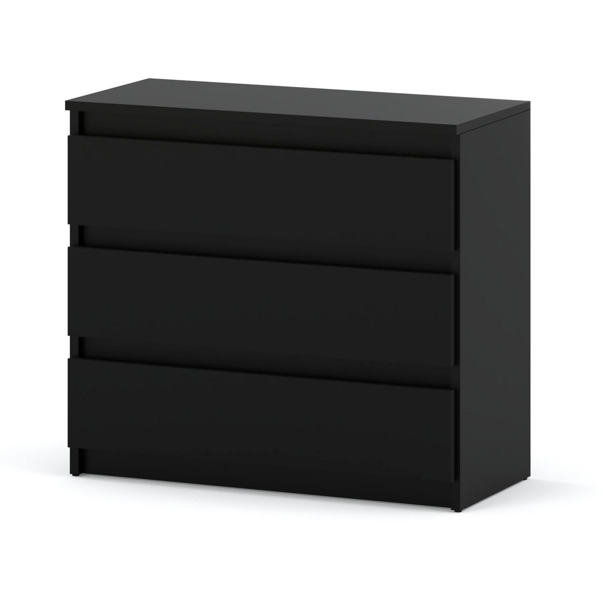 Entdecken Sie Eleganz und Funktionalität mit unserer Kommode mit 3 Schubladen in mattem Schwarz. Das minimalistische Design mit grifflosen Fronten und einer strapazierfähigen Laminatplatte eignet sich hervorragend für das Wohnzimmer, das Schlafzimmer oder den Flur.