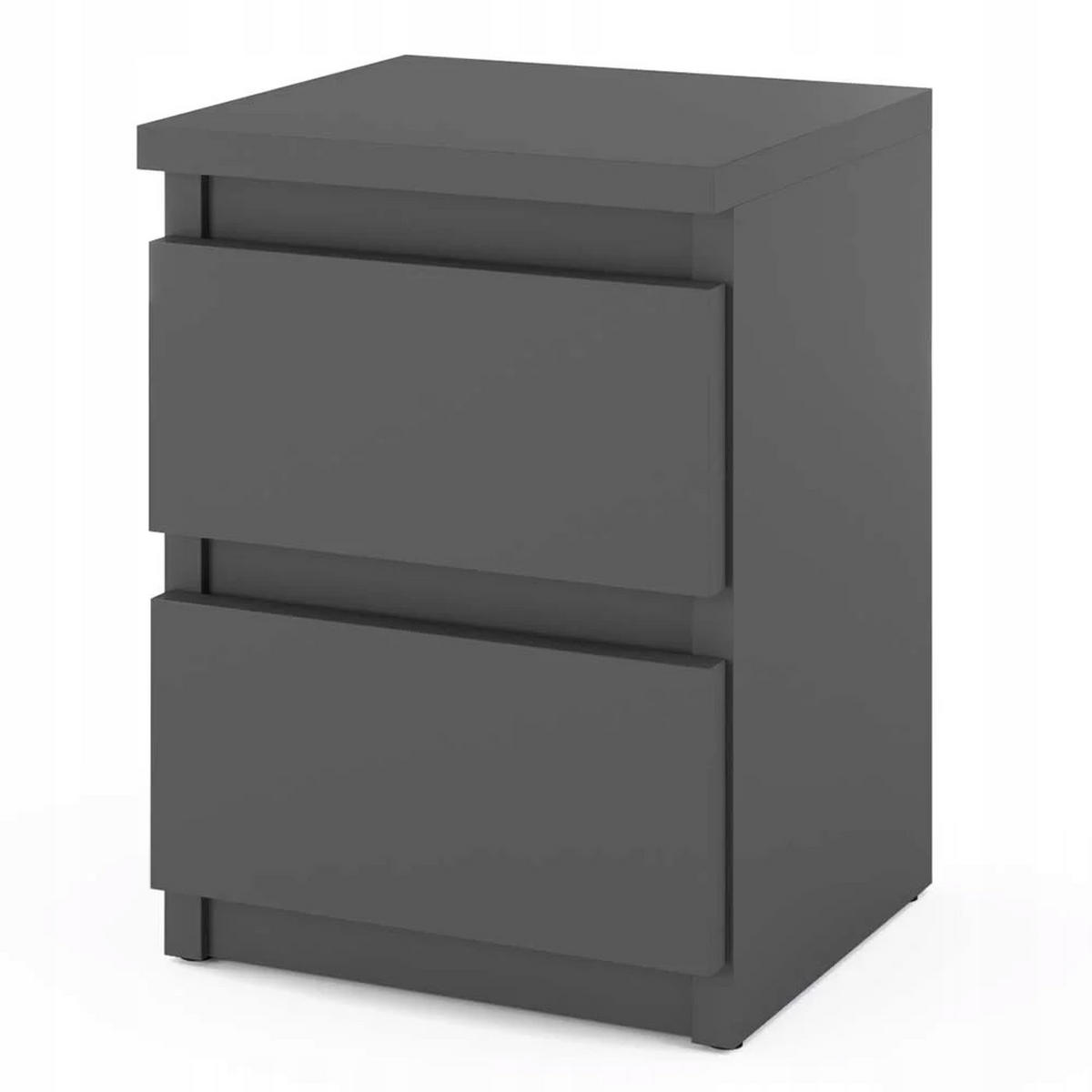 Der Nachttisch 30 cm in mattem Grau ist ein funktionales und ästhetisches Möbelstück für jedes Schlafzimmer. Ausgestattet mit zwei grifflosen Schubladen auf Kugelführungen mit Verriegelung, gewährleistet er eine reibungslose und geräuscharme Funktion sowie eine sichere Aufbewahrung. Dank seiner kompakten Abmessungen (Breite 30 cm, Höhe 42,5 cm, Tiefe 30,5 cm) eignet er sich auch ideal für kleine Räume. Er besteht aus 16 mm starker Laminatplatte mit 0,7 mm ABS-Kanten und bietet Langlebigkeit und Stabilität.