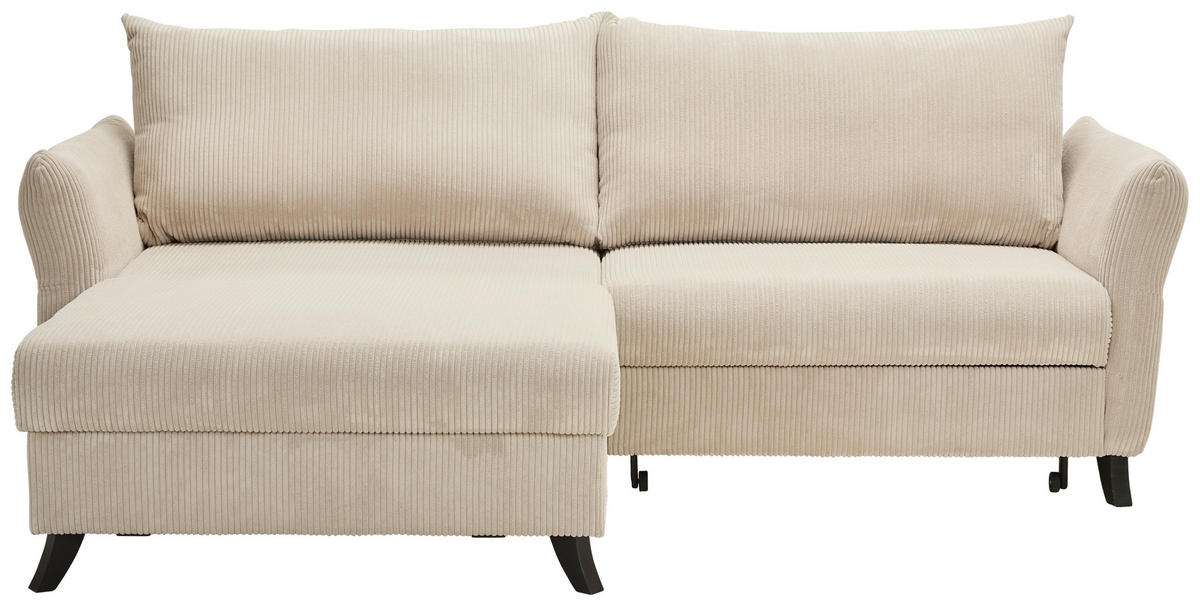 Können Sie sich etwas Besseres vorstellen als auf diesem beigen Ecksofa mit Cord-Bezug alles um sich herum zu vergessen?