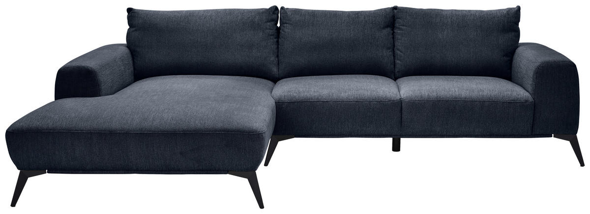 Im Lieferumfang enthalten: Rein in die Komfortzone: Dieses dunkelblaue Ecksofa mit Webstoff-Bezug entführt Sie auf ein traumhaftes Terrain zum geruhsamen Durchatmen!