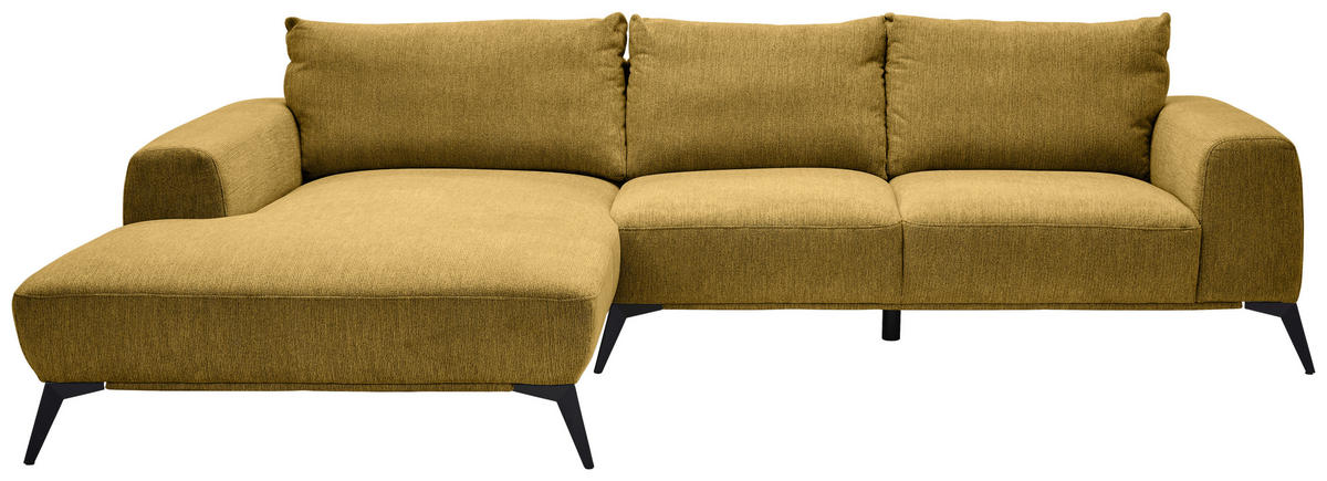 Im Lieferumfang enthalten: Können Sie sich etwas Besseres vorstellen als auf diesem dunkelgelben Ecksofa mit Webstoff-Bezug alles um sich herum zu vergessen?