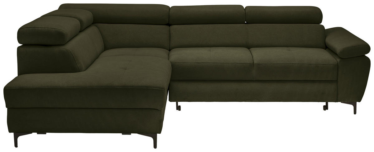 Wenn dieses dunkelgrüne Ecksofa mit Flachgewebe-Bezug bei Ihnen einzieht, übernimmt Behaglichkeit das Kommando!