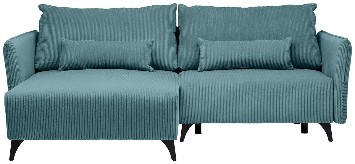 Eine Sonderportion Wohnglück schenkt Ihnen dieses türkise Ecksofa mit Cord-Bezug. Greifen Sie zu!