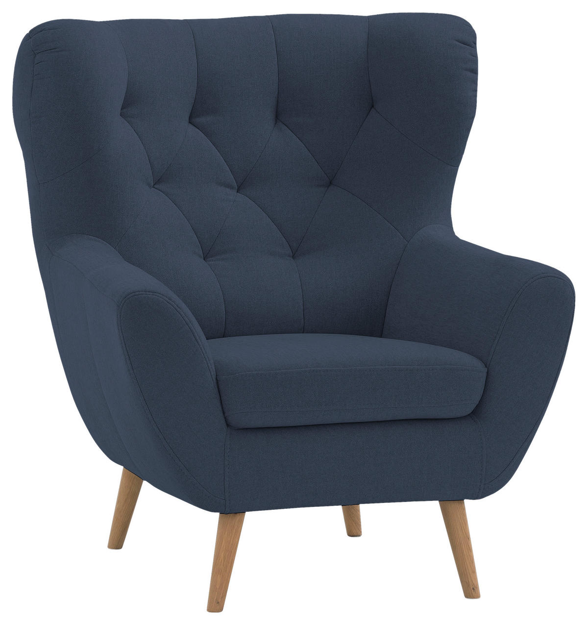Ein Ohrensessel mit Flachgewebe-Bezug in Dunkelblau, der begeistert