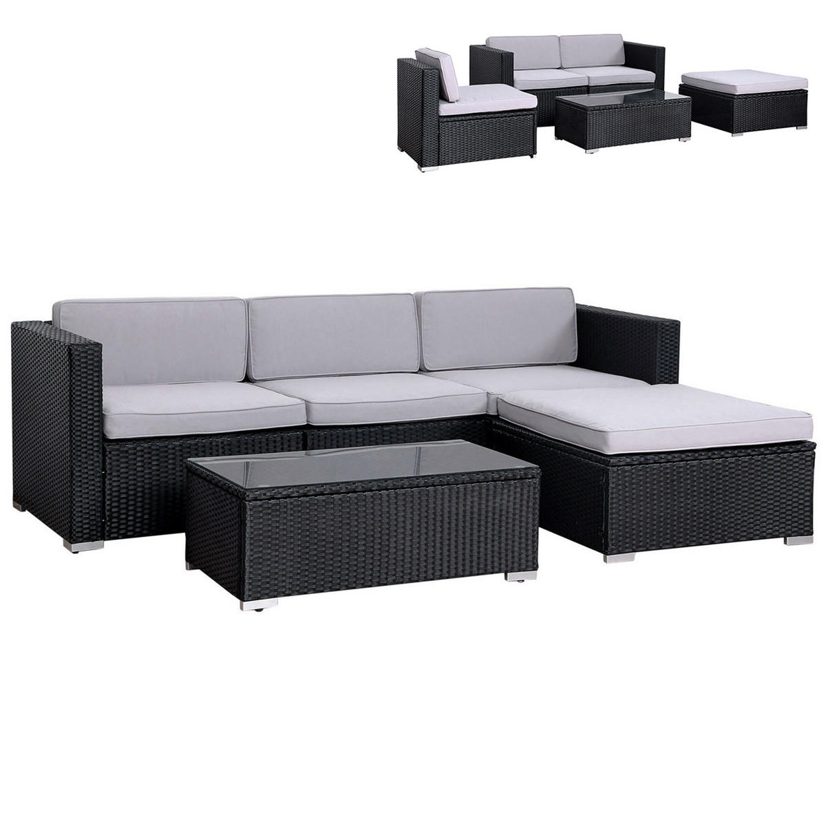 - Farbe: Schwarz (Polyrattan), Grau (Kissen)