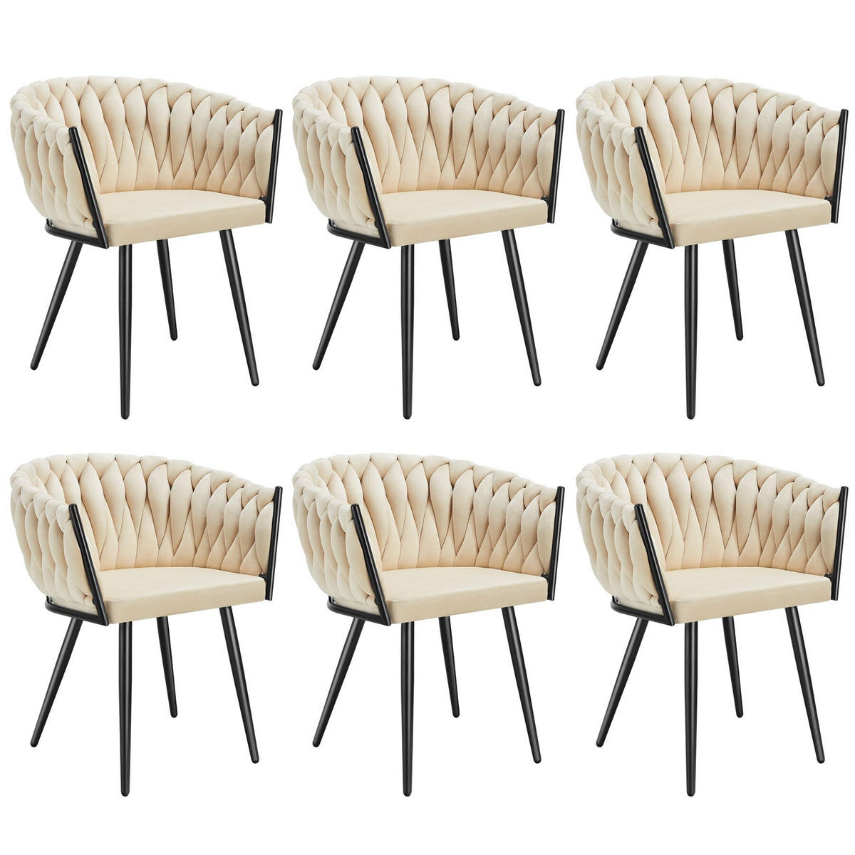 Highlights:- 6er Set bequeme Esszimmerstühle mit durchgehender Arm- und Rückenlehne in eleganter Knotenoptik