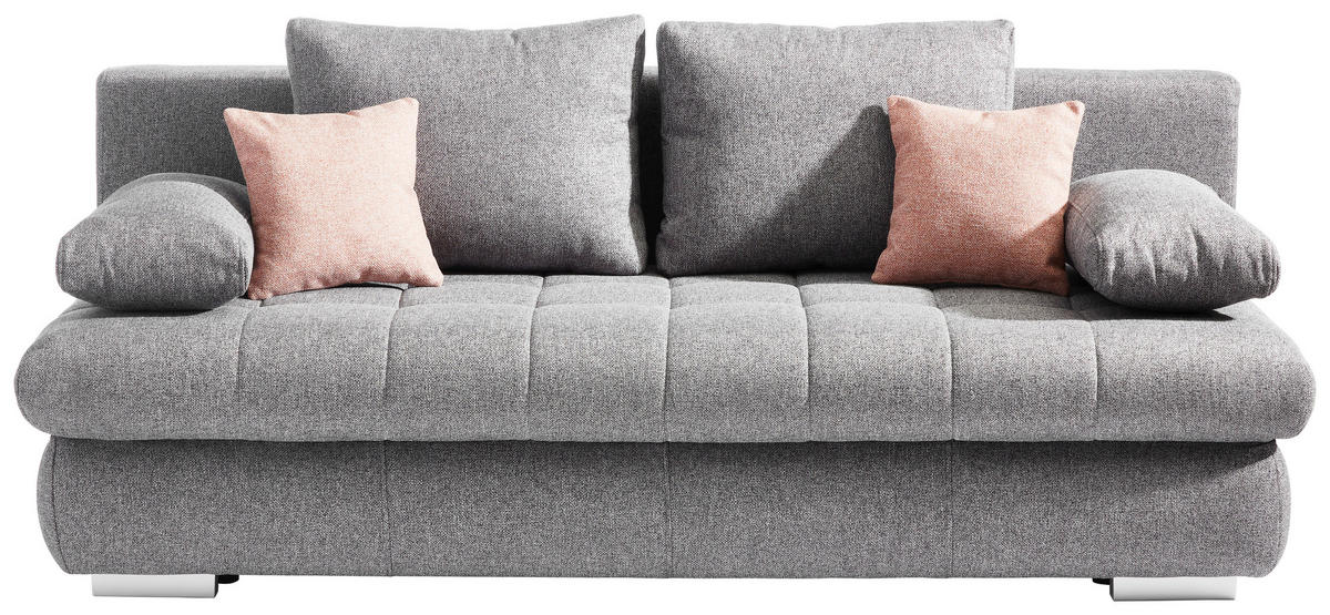 Das Design steht bei diesem Sofa der Funktionalität in nichts nach: Die rosafarbenen Zierkissen sind auf den Bezug in zeitlosem Hellgrau abgestimmt und verleihen dem Möbel einen trendigen Look. Ob im Gäste- oder Wohnzimmer, der echt bezogene Rücken ermöglicht das freie Aufstellen im Raum. Auf diese Weise setzen Sie Ihr Einrichtungskonzept nach Herzenslust um. Auf diesem Schlafsofa in Grau mit Bettkasten probieren Sie's mit Gemütlichkeit!
