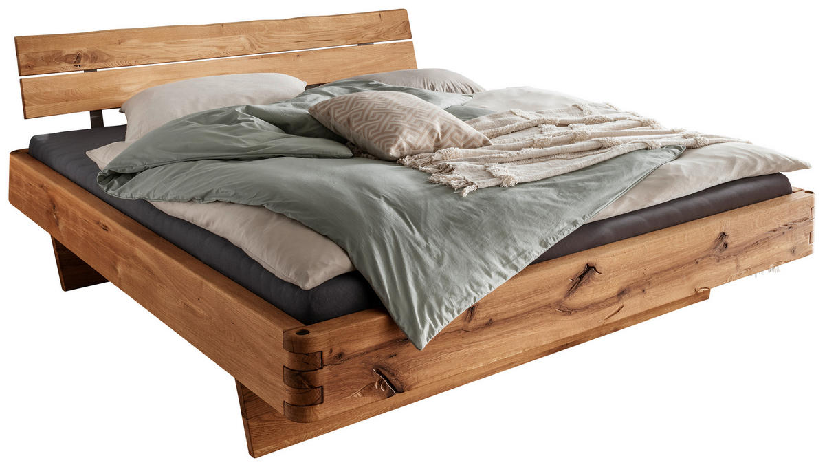 Mehr als ein funktionales Element ist das Kopfteil, denn hier lehnen Sie sich gerne an, um den Tag ausklingen zu lassen. Stimmige Akzente setzen dazu die hohen Wangen-Füße, deren Höhe zudem eine Belüftung von unten ermöglicht. Machen Sie es sich gemütlich in diesem Balkenbett (ca. 200 x 200 cm) aus Wildeiche mit Holz-Kopfteil und genießen Sie jede Minute!