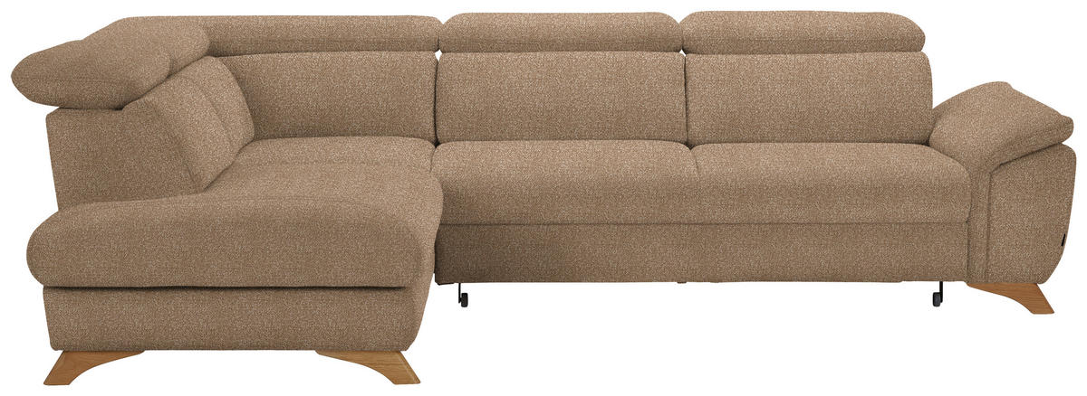 Genießen Sie Ihr Rendezvous mit der wohligen Unbeschwertheit des Seins auf diesem hellbraunen Ecksofa mit Bouclé-Bezug!