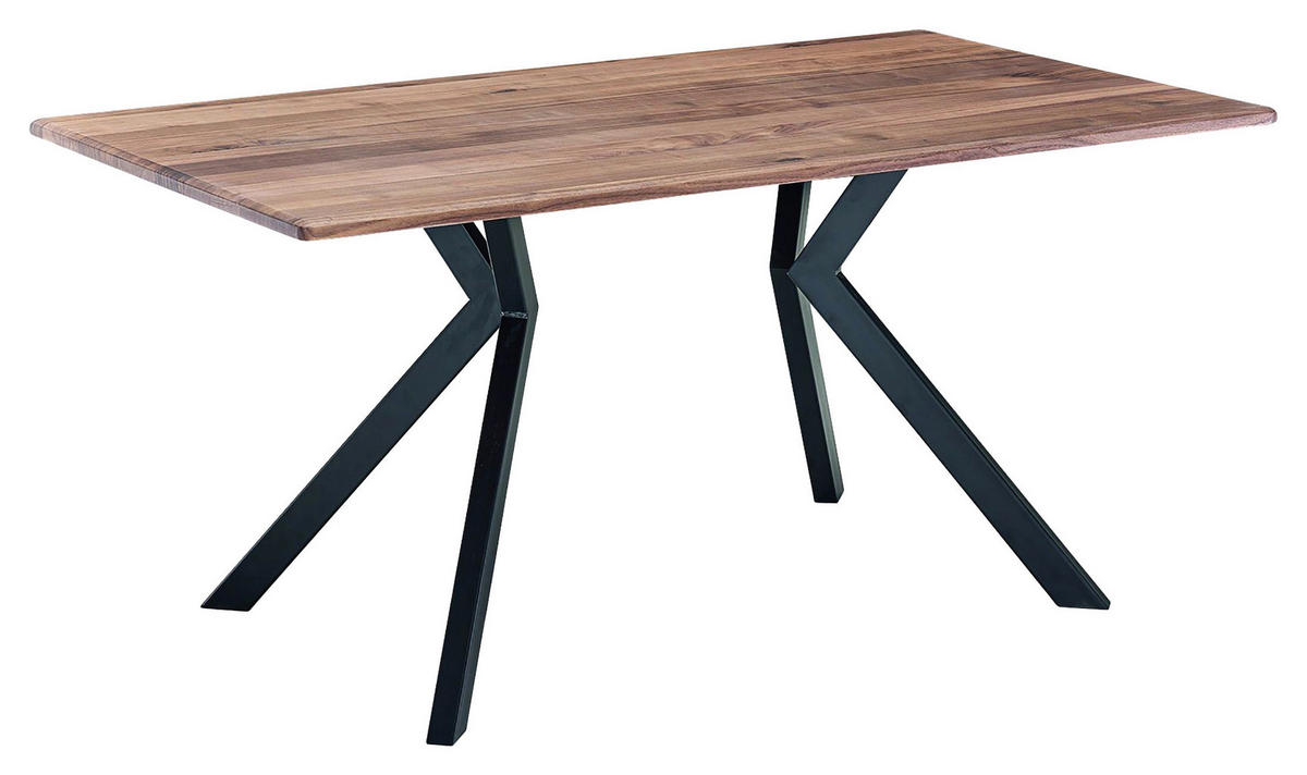 Dieser Esstisch (ca. 160 x 90 cm) aus Nussbaum massiv und Metall setzt auf einen spannenden Materialmix. Ausgestellte Beine aus pulverbeschichtetem Metall in Schwarz bilden die Basis. Sie tragen die großzügige Tischplatte aus geöltem Nussbaumholz und bilden so einen modernen Kontrast zum authentischen Material.