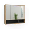 Dieser Badezimmer-Spiegelschrank verfügt über drei Spiegeltüren und offene Regale mit reichlich Stauraum. Er ist ideal für das Aufbewahren von Badutensilien und Kosmetika.