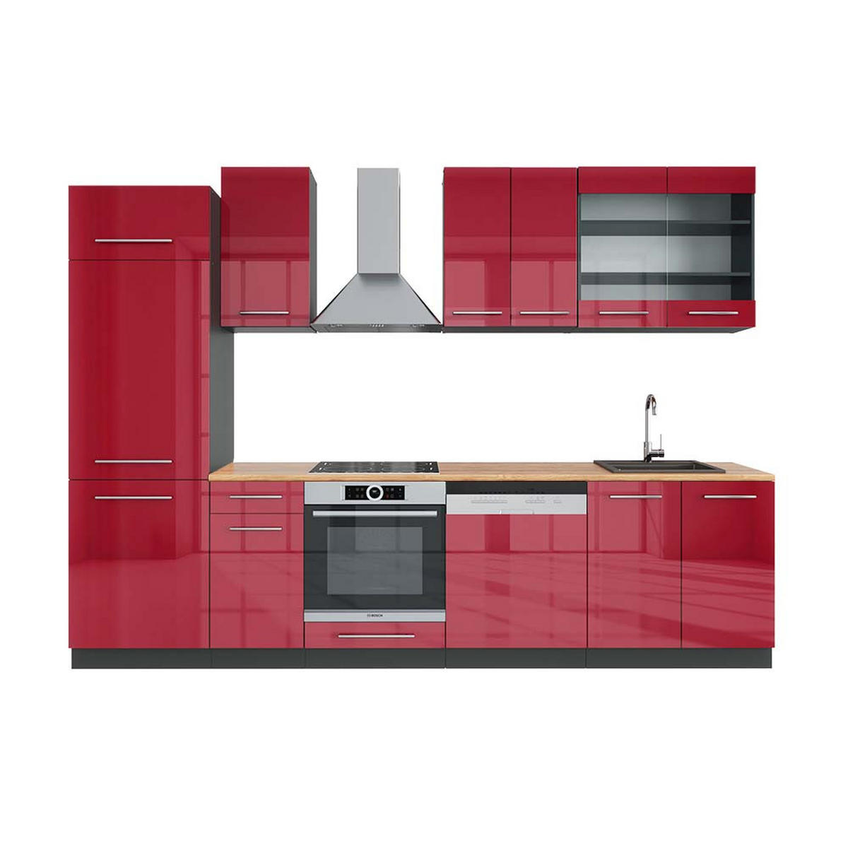 KÜCHENZEILE Fame-Line Bordeaux Hochglanz/Anthrazit 300 cm , AP Eiche - Bordeaux/Anthrazit, Holzwerkstoff (300/81.6/60cm) - Vicco