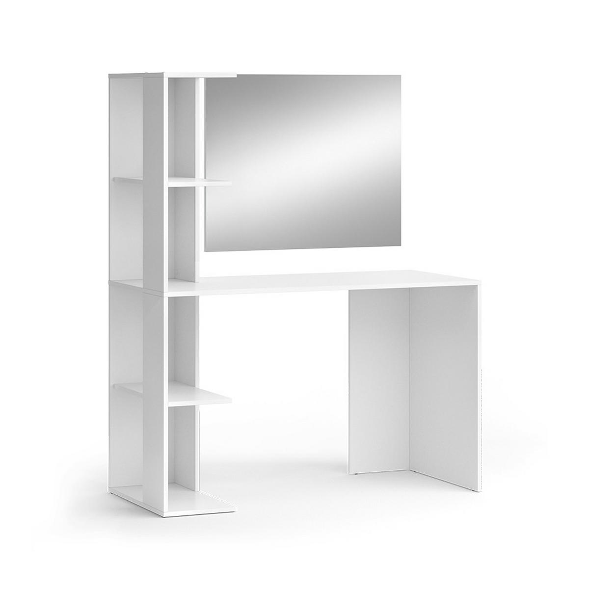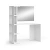 Der Frisiertisch mit Spiegel verfügt über ein praktisches Seitenregal mit 4 Fächern, das ideal für kleine Räume geeignet ist. Zudem bietet er einen bequemen Schminkplatz für das tägliche Styling.
