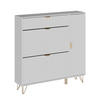MATERIAL: Der Schuhschrank besteht aus pflegeleichten 12,5 mm Spanplatte. Die Fronten bestehen aus 15 mm MDF. Griffe und Füße sind auf Metall gefertigt.