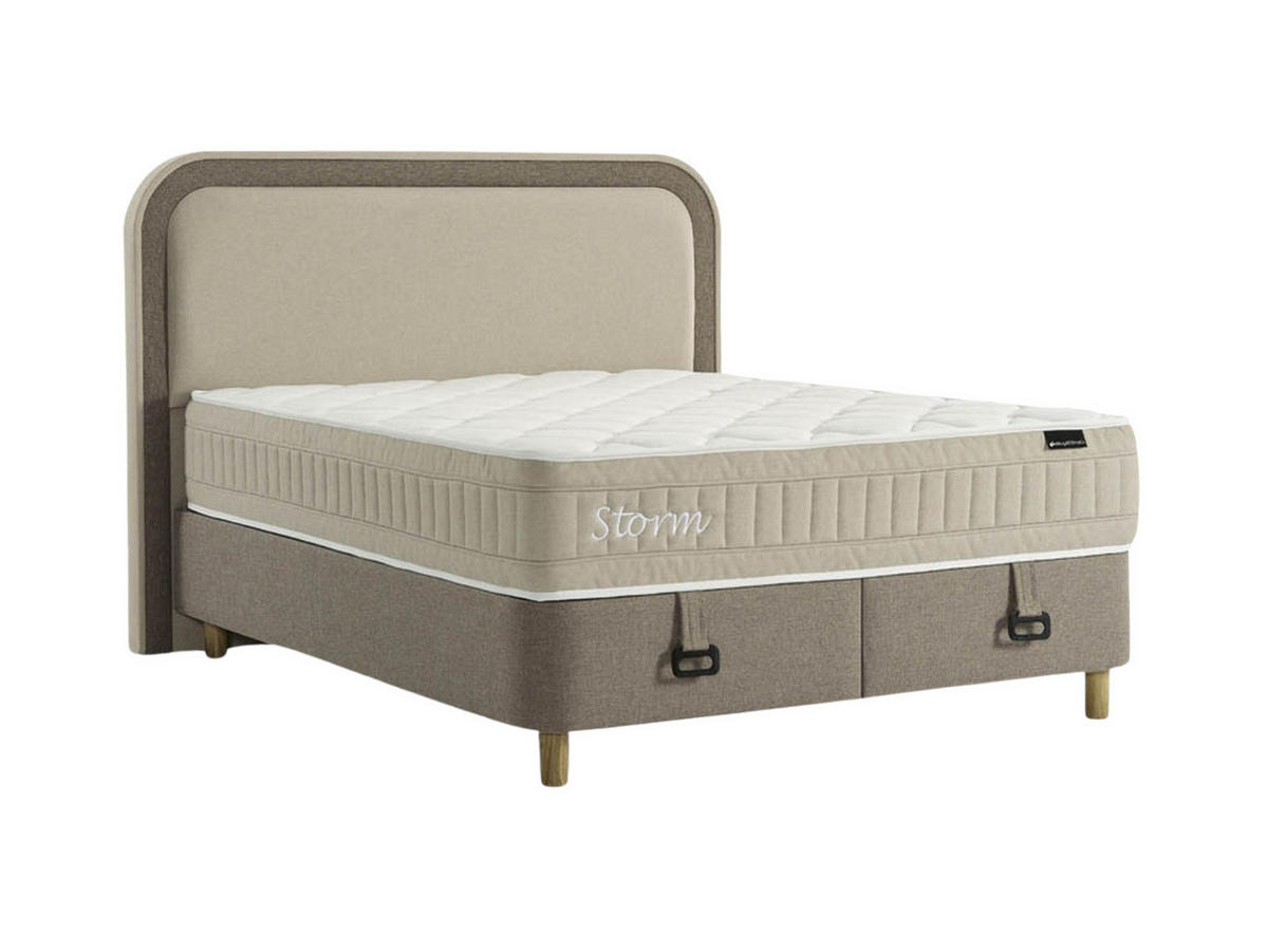 Das Storm Bett Set verbindet modernes Design mit spürbarem Schlafkomfort und starker Unterstützung im Alltag. Im Mittelpunkt steht die hochwertige 7-Zonen Taschenfederkernmatratze, die Schulter, Rücken, Becken und Beine gezielt unterstützt und für ein ausgewogenes Liegegefühl sorgt. Die komfortable Matratzenhöhe von ca. 30 cm erleichtert das Ein- und Aussteigen und bietet angenehmen Schlafkomfort. Mehrschichtige Komfortmaterialien fördern Druckentlastung und eine gute Körperanpassung. Der hochwertige Collagen-Bezug sorgt für eine angenehme Oberfläche und ein gepflegtes Schlafgefühl. Das weich gepolsterte Kopfteil mit abgerundeter Form verleiht dem Bett eine stilvolle und moderne Ausstrahlung. Die integrierte Bettbox bietet zusätzlichen Stauraum für Decken, Kissen oder Bettwäsche.