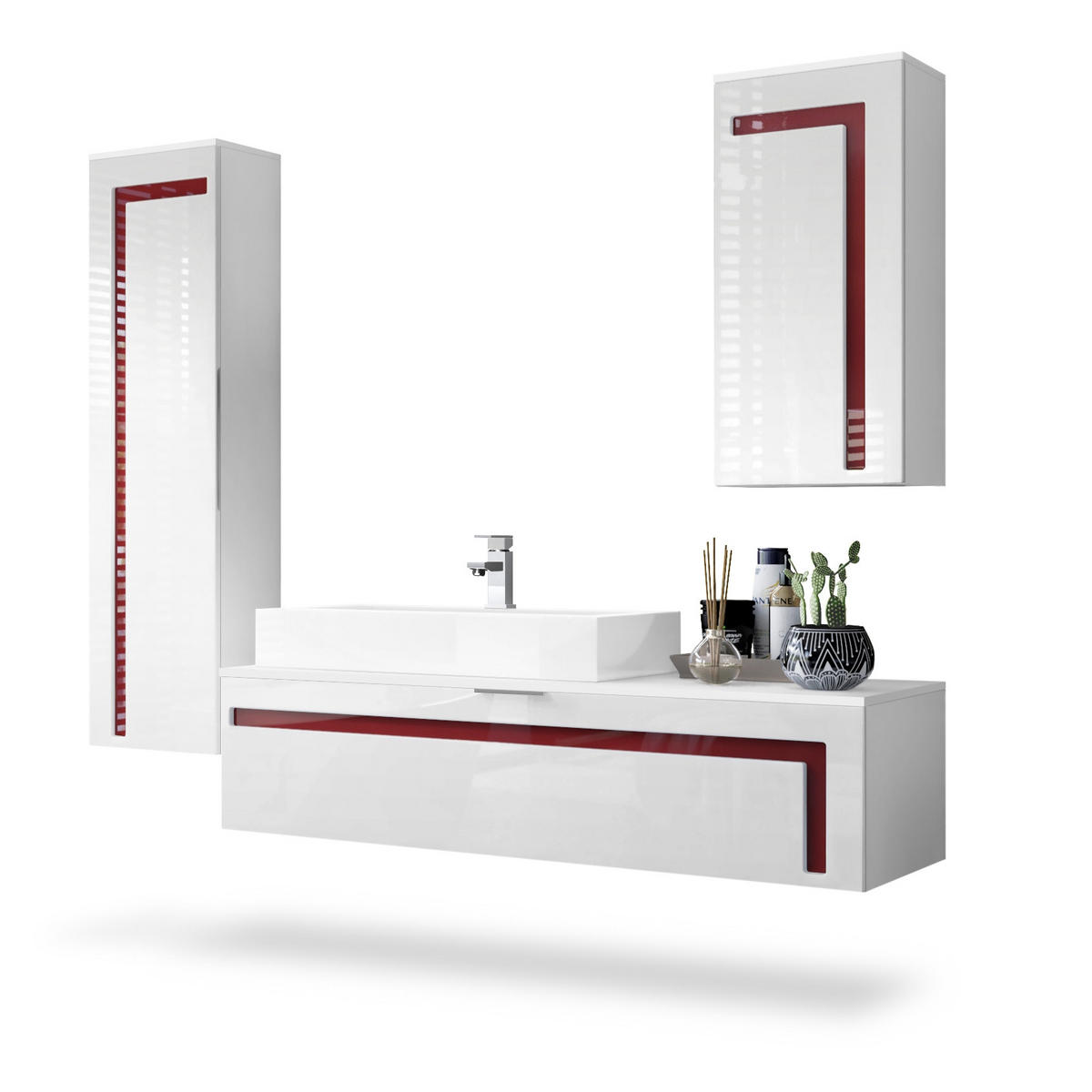Design: Der Korpus des Badezimmersets in Weiß matt und die Fronten in Weiß Hochglanz, sowie die Absetzungen in Bordeaux Hochglanz sorgen für ein modernes, wohnliches Ambiente. Oder wählen Sie aus vielen, weiteren Farbkombinationen das passende Design.