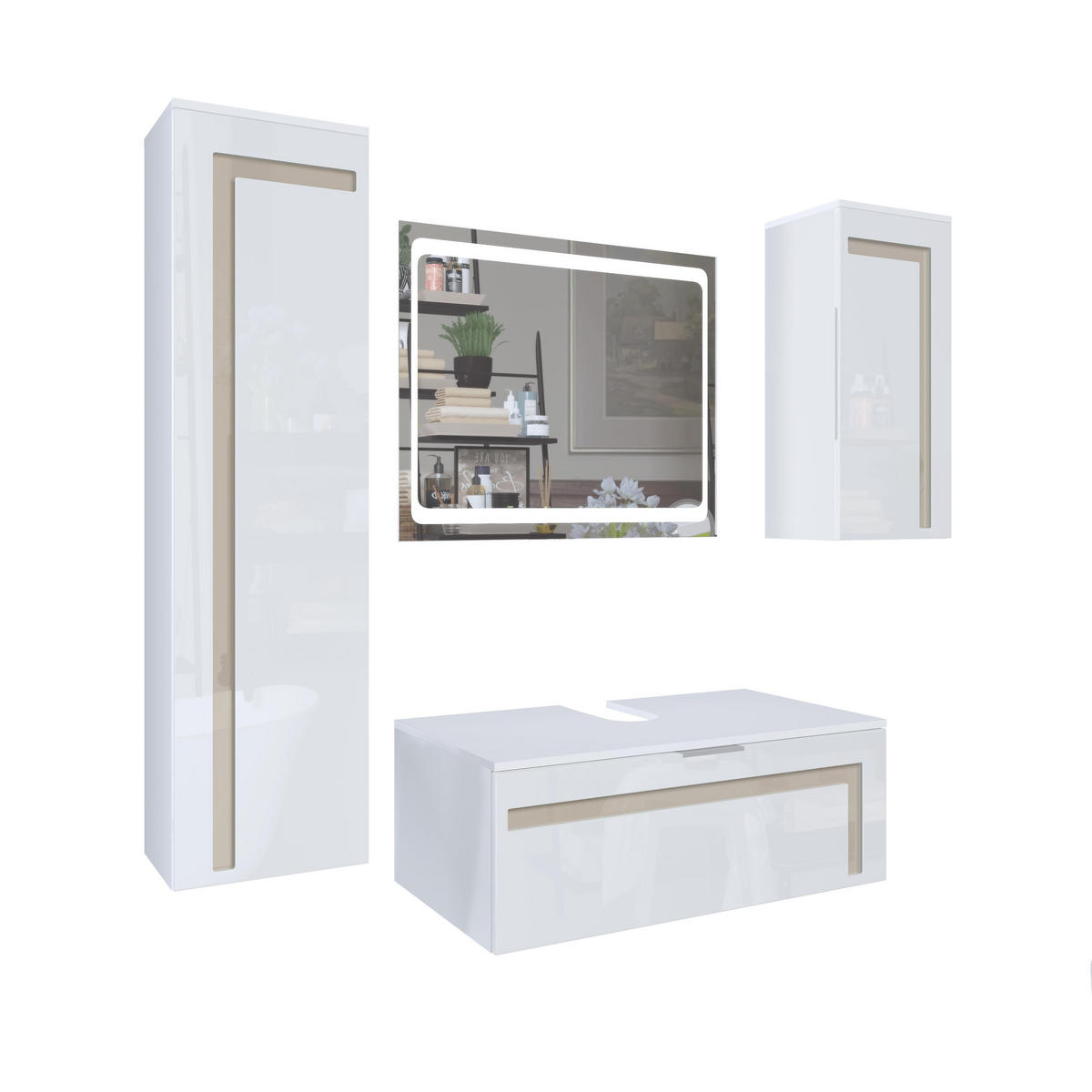 Design: Der Korpus des Badezimmersets in Weiß matt und die Fronten in Weiß Hochglanz, sowie die Absetzungen in Sandgrau Hochglanz sorgen für ein modernes, wohnliches Ambiente. Oder wählen Sie aus vielen, weiteren Farbkombinationen das passende Design.