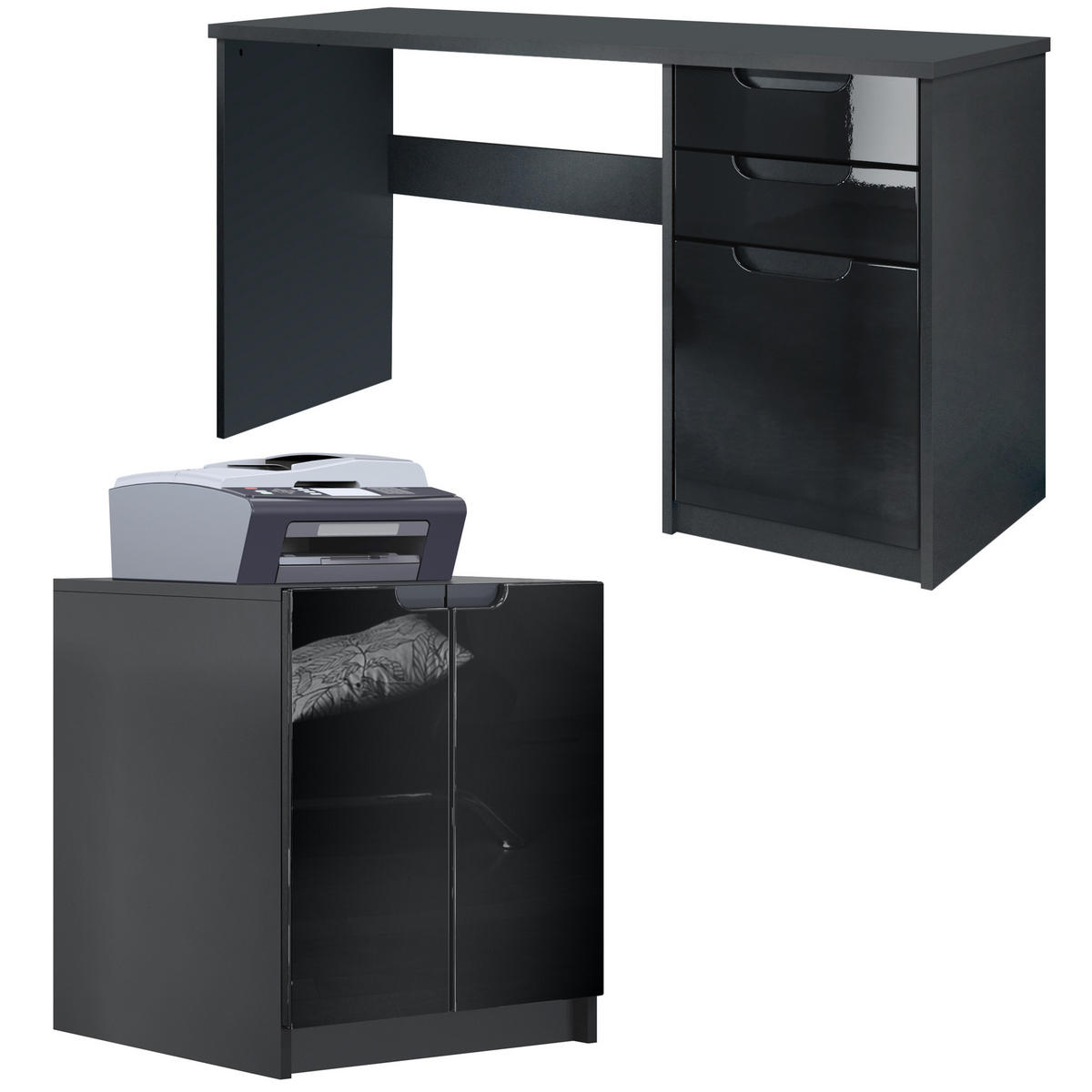 Design: Der Korpus des Büromöbel-Sets in Schwarz matt und die Fronten in Schwarz Hochglanz sorgen für ein modernes, wohnliches Ambiente. Alternativ sind viele weitere Farbkombinationen auswählbar.