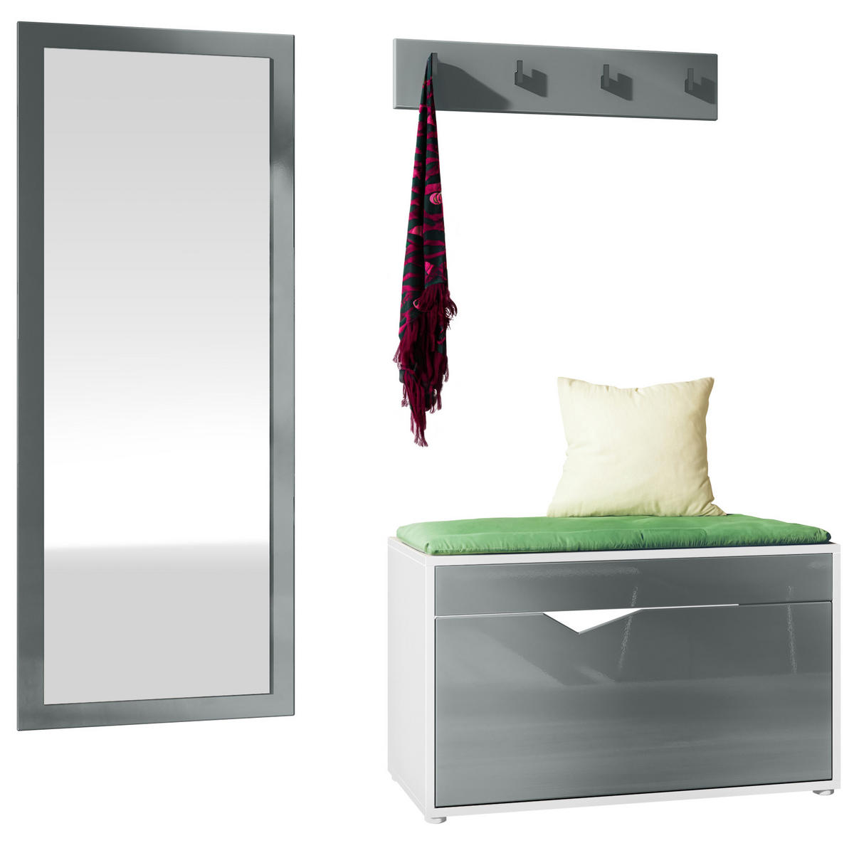 Design: Der Korpus der Flurgarderobe Hanko in Weiß matt und die Fronten in Grau Hochglanz sorgen für ein modernes, wohnliches Ambiente. Oder wählen Sie aus vielen, weiteren Farbkombinationen das passende Design.