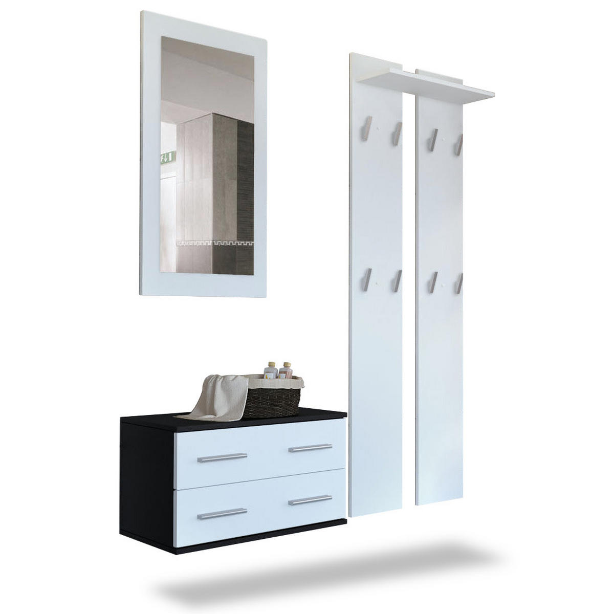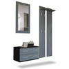 Stauraum: Das moderne Garderobenset für den Flur ist ein wahres Platzwunder - 1 Schubladenhänger, 2 Garderobenpaneele mit Ablage und 1 Wandspiegel bieten viel Stauraum für allerlei Gegenstände im Flur, wie z.B. für Schuhe, Jacken und Accessoires.