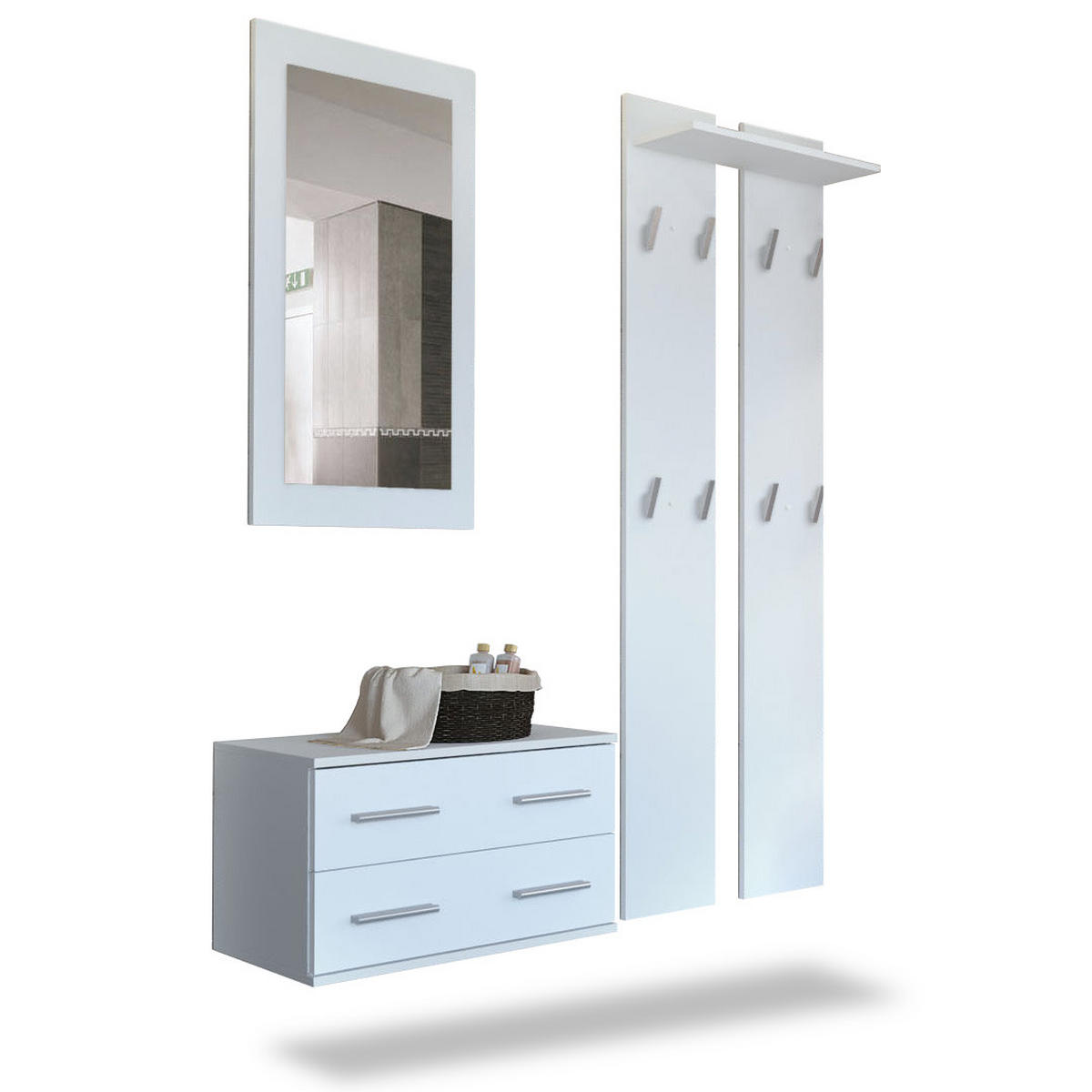 Lieferumfang: Enthalten sind jeweils 1 Schubkastenhänger, 2 Wandpaneele mit Garderobenhaken und 1 Wandspiegel, sowie eine detaillierte bebilderte Anleitung und das notwendige Montagematerial. Schneller und einfacher Aufbau garantiert!