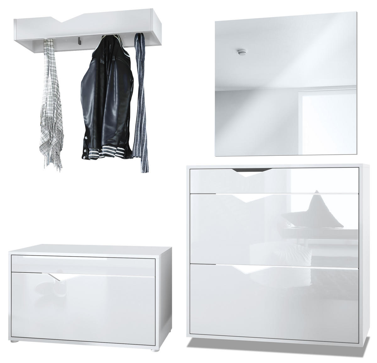 Design: Der Korpus des Garderobensets in Weiß matt und die Fronten in Weiß Hochglanz sorgen für ein modernes, wohnliches Ambiente. Oder wählen Sie aus vielen, weiteren Farbkombinationen das passende Design.