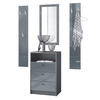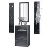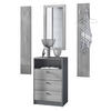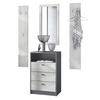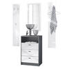 Lieferumfang: 1 Kommode, 2 Wandpaneele, 1 Wandspiegel, Aufbauanleitung und Montagematerial. Maße der einzelnen Komponenten: Kommode 56 B x 86,5 H x 36 T cm, Spiegel 89 B x 45 H cm, ein Paneel 140 H x 23,5 B cm