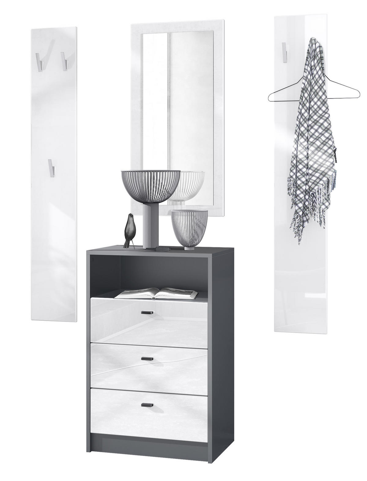 Stauraum: Das moderne Garderobenset ist ein wahres Platzwunder – die Anrichte mit 2 Schubladen und einem offenen Fach sowie die 2 Garderobenpaneele mit insgesamt 6 Wandhaken bieten viel Stauraum für Accessoires und Kleidung.
