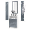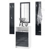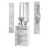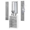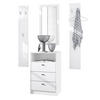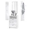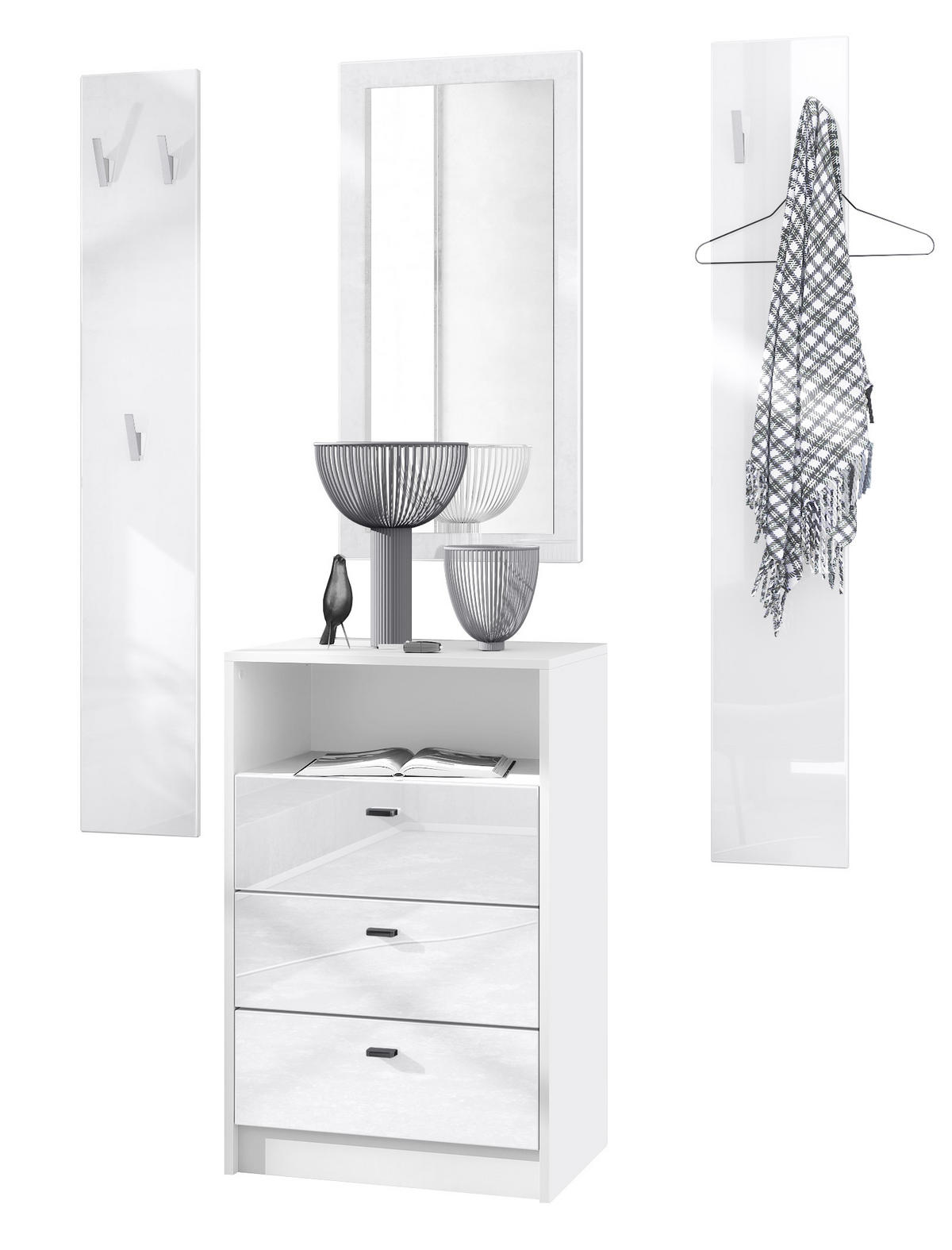 Lieferumfang: 1 Kommode, 2 Wandpaneele, 1 Wandspiegel, Aufbauanleitung und Montagematerial. Maße der einzelnen Komponenten: Kommode 56 B x 86,5 H x 36 T cm, Spiegel 89 B x 45 H cm, ein Paneel 140 H x 23,5 B cm