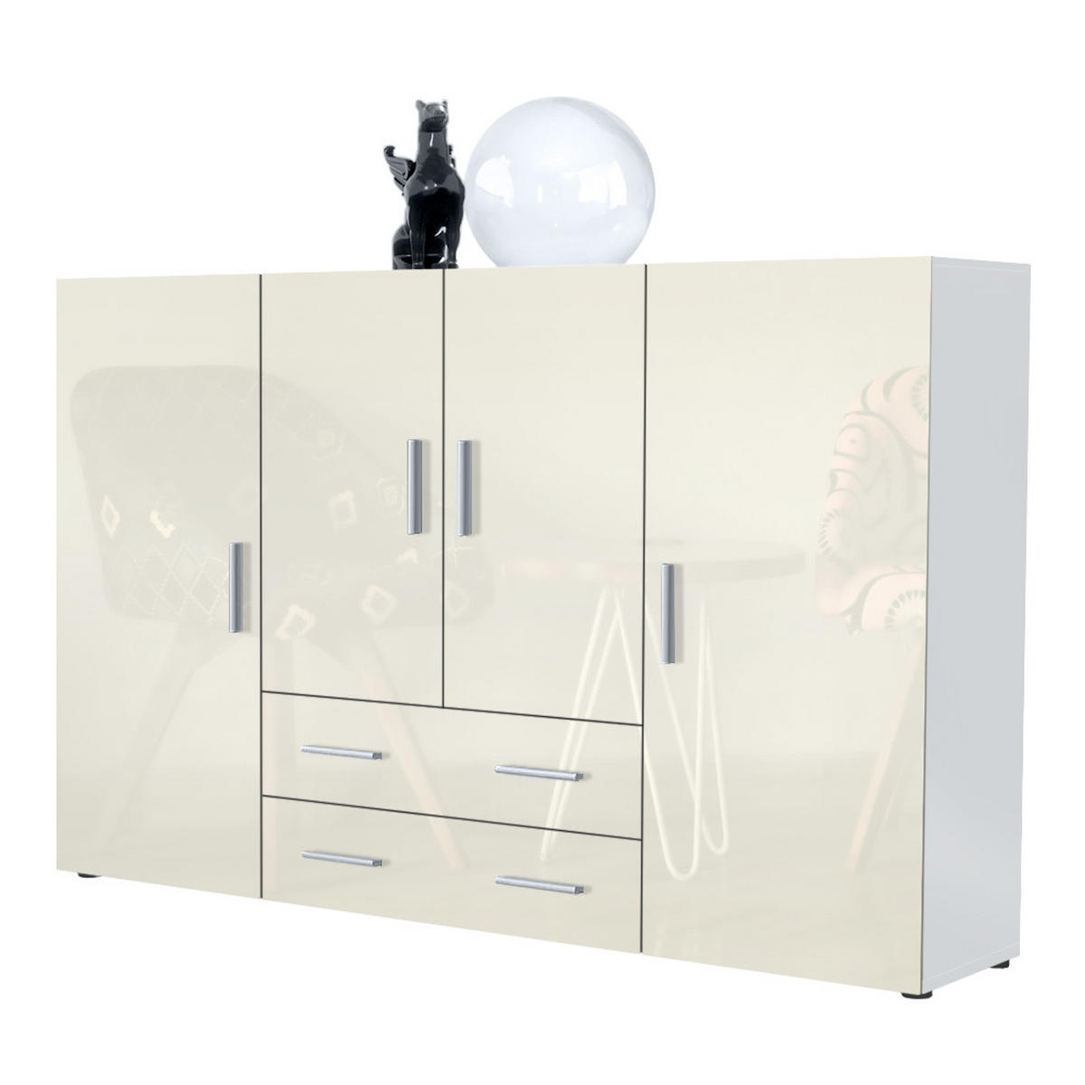 Design: Der Korpus der Anrichte in Weiß matt und die Fronten in Creme Hochglanz sorgen für ein modernes, wohnliches Ambiente. Oder wählen Sie aus vielen, weiteren Farbkombinationen das passende Design.
