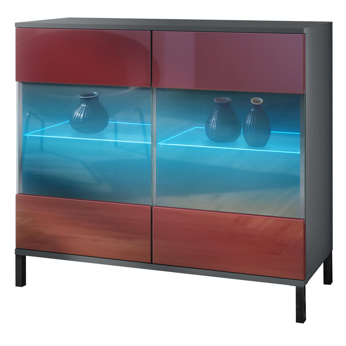 Design: Das minimalistische Design des Sideboards wird durch den eleganten Korpus in Anthrazit matt und die frontale Gestaltung in Bordeaux Hochglanz unterstrichen. Oder wählen Sie aus vielen, weiteren Farbkombinationen das passende Design.