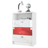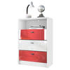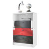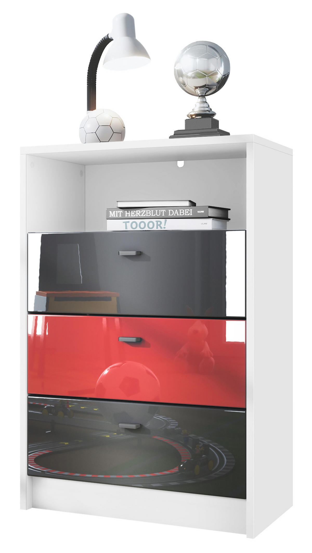 Fußball-Motiv: Die Pino V2 Kommode hat einen weißen Korpus und drei Schubladen in den hochglänzenden Farben Schwarz, Rot und Schwarz – ein echter Hingucker für jedes Fanzimmer!