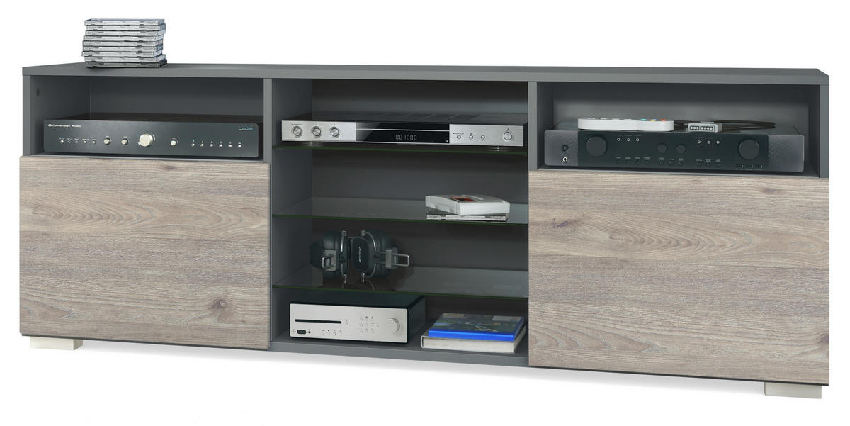 Material: Dank hochwertig foliierter MDF-Fronten und einem Korpus aus Spanplatten mit Melaminbeschichtung ist der TV-Ständer angenehm leicht, stabil und pflegeleicht. Wertige Verarbeitung - Made in Germany.