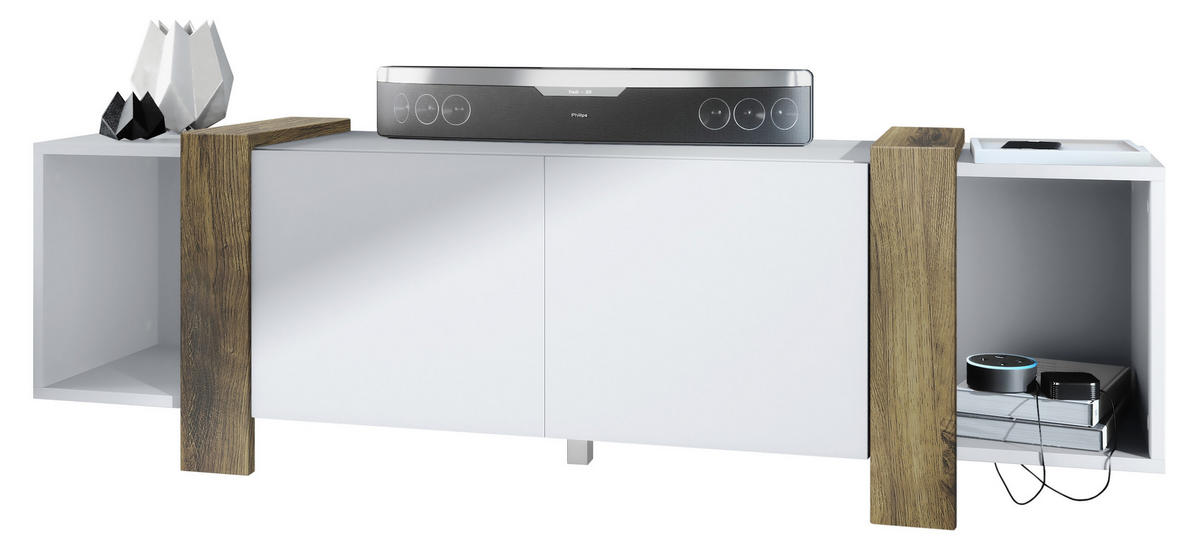 Reichlich Stauraum: Der TV-Schrank hat insgesamt 4 Fächer, zwei offene und zwei weitere hinter den mittigen Türen, damit allerlei Gegenstände gut sortiert untergebracht werden können