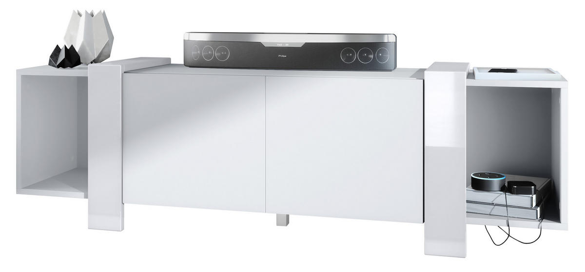 Reichlich Stauraum: Der TV-Schrank hat insgesamt 4 Fächer, zwei offene und zwei weitere hinter den mittigen Türen, damit allerlei Gegenstände gut sortiert untergebracht werden können