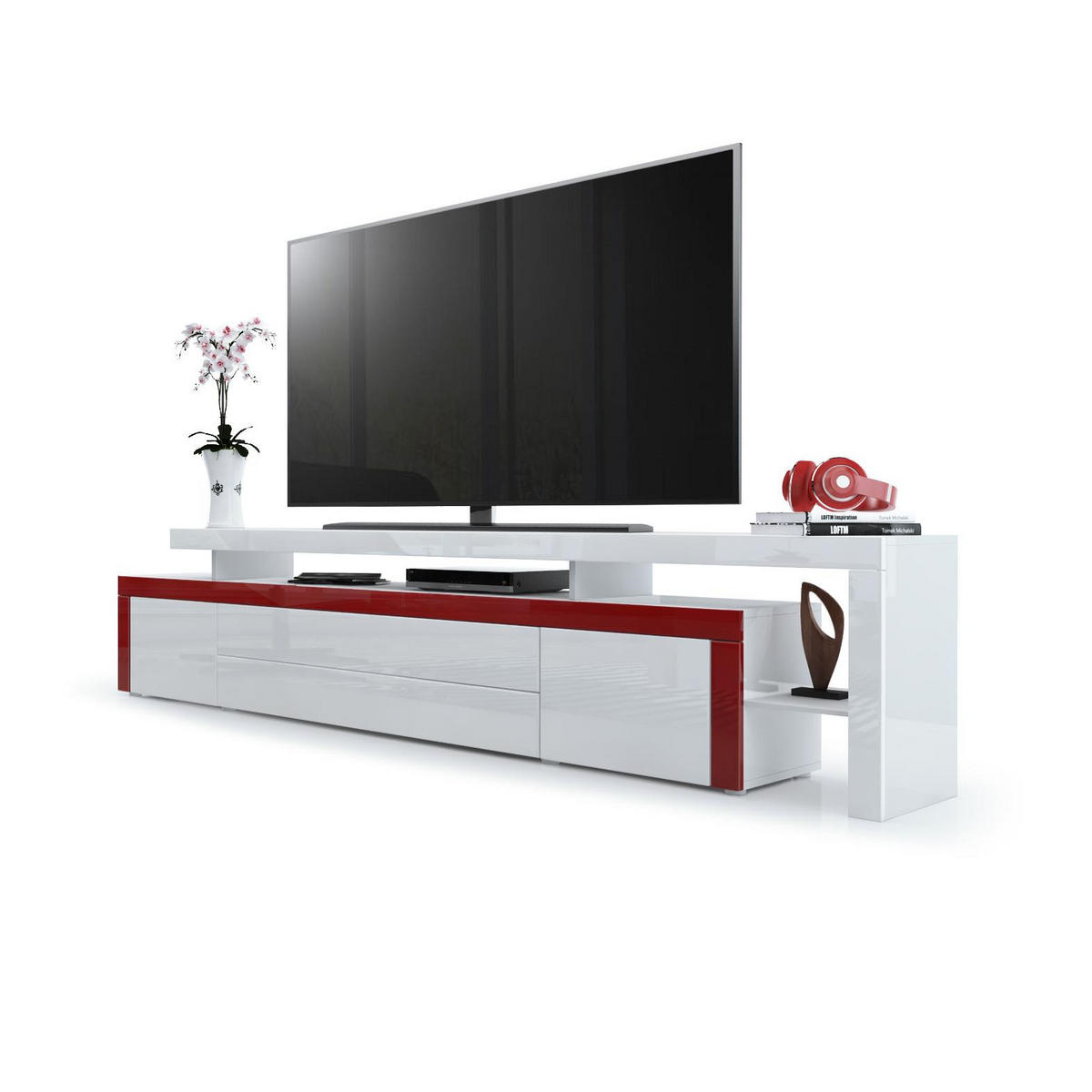 Design: Der Korpus des TV-Boards in Weiß Hochglanz, die Fronten in Weiß Hochglanz und die Rahmen in Bordeaux Hochglanz machen dieses Möbelstück zu einem echten Hingucker. Wählen Sie Ihre bevorzugte Farbkombination!