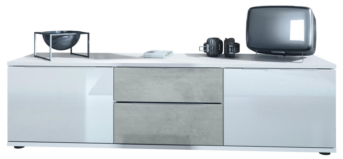 Design: Der Korpus des TV-Boards ist in mattem Weiß gehalten, die Türen in Weiß Hochglanz und die Schubladen in Beton Oxid Optik. Alternativ können Sie aus zahlreichen Farbkombinationen das passende Design auswählen.