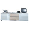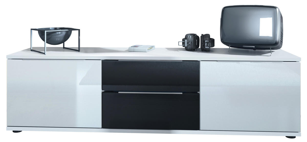 Design: Der Korpus des TV-Boards ist in mattem Weiß gehalten, die Türen in Weiß Hochglanz und die Schubladen in Schwarz Hochglanz. Alternativ können Sie aus zahlreichen Farbkombinationen das passende Design auswählen.