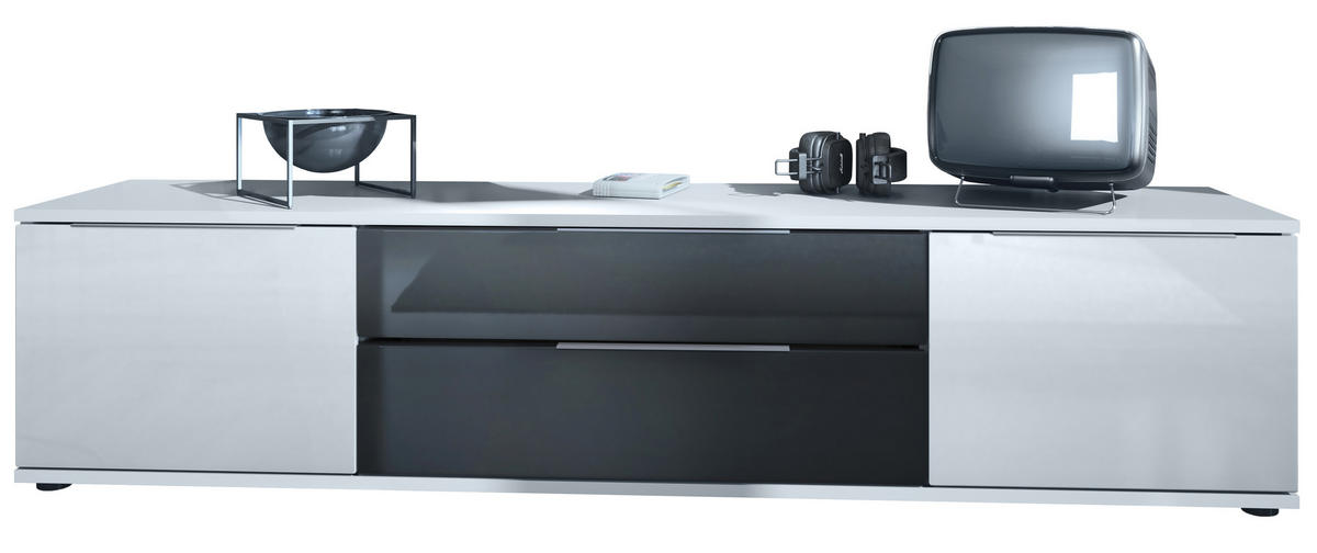 Design: Der Korpus des TV-Boards ist in mattem Weiß gehalten, die Türen in Weiß Hochglanz und die Schubladen in Schwarz Hochglanz. Alternativ können Sie aus zahlreichen Farbkombinationen das passende Design auswählen.
